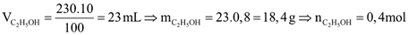 Câu 4. Thực hiện phản ứng lên men giấm 230 ml dung dịch ethanol 10o, thu được dung dịch T. Cho 3,25 gam Zn vào T, sau khi phản ứng xảy ra hoàn toàn, thu được 991,6 mL khí (đkc). Biết khối lượng riêng của ethanol và nước lần lượt là 0,80 g/mL và 1,00 g/ml. Nồng độ phần trăm của acetic acid trong dung dịch T là bao nhiêu? Biết hiệu suất của quá trình lên men giấm là 78% (làm tròn đến chữ số hàng chục)