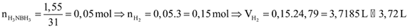 Câu 3. Borazane (H3NBH3) là nguồn nguyên liệu hydrogen bằng cách tác dụng với chlorhydric acid. Giả sử ở 25 0C, 1 bar thì 1,55 gam borazane phản ứng vừa đủ với chlorhydric acid theo sơ đồ sau: