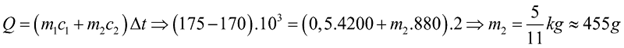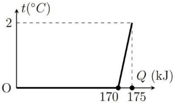 Câu 6: Sự biến thiên nhiệt độ của khối nước đá đựng trong ca nhôm theo nhiệt lượng cung cấp được cho trên đồ thị. Cho nhiệt dung riêng của nước và nhôm lần lượt là c1 = 4200 J/kg. K; c2 = 880 J/ kg. K, nhiệt nóng chảy của nước đá là λ = 3,4. 105 J/kg. Khối lượng của ca nhôm bằng bao nhiêu g (làm tròn đến phần nguyên)?