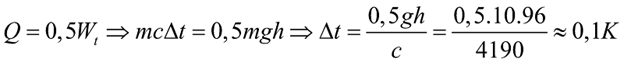 Câu 5: Tại một đập thủy điện, người ta cho nước rơi từ độ cao 96 m xuống và đập vào cánh tuabin làm quay máy phát điện, biết rằng 50% thế năng của nước làm nước nóng lên. Cho biết nhiệt dung riêng của nước là 4190 J/kg.K. Lấy g = 10 m/s2. Độ biến thiên nhiệt độ (K) của nước là bao nhiêu? (làm tròn đến 1 chữ số sau dấu phẩy)